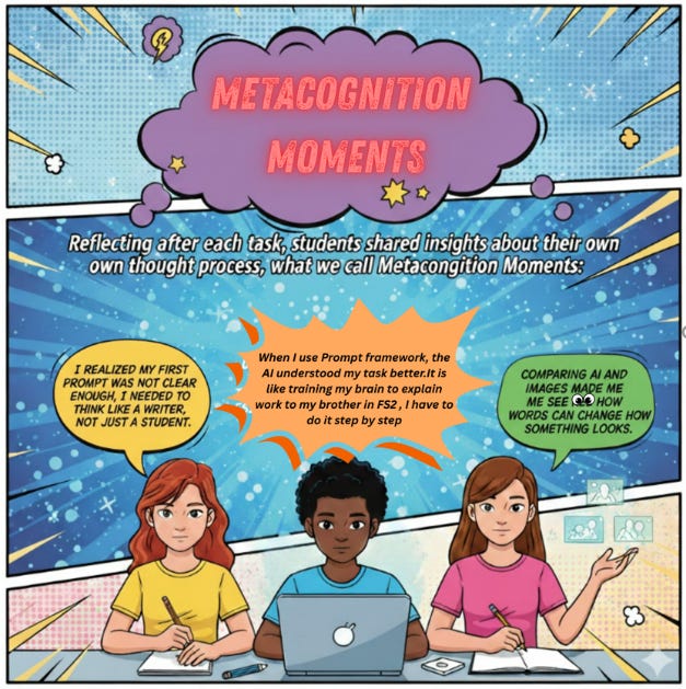 Each activity reinforced the same core idea: better thinking leads to better prompting and better prompting leads to better learning and AI generated outcomes. Throughout, students were encouraged to think metacognitively: “What did my prompt do? What might I change next time? Why did the AI respond like that?” That kind of self-reflection is exactly the kind of mindful AI integration work we aim to embed across the school.