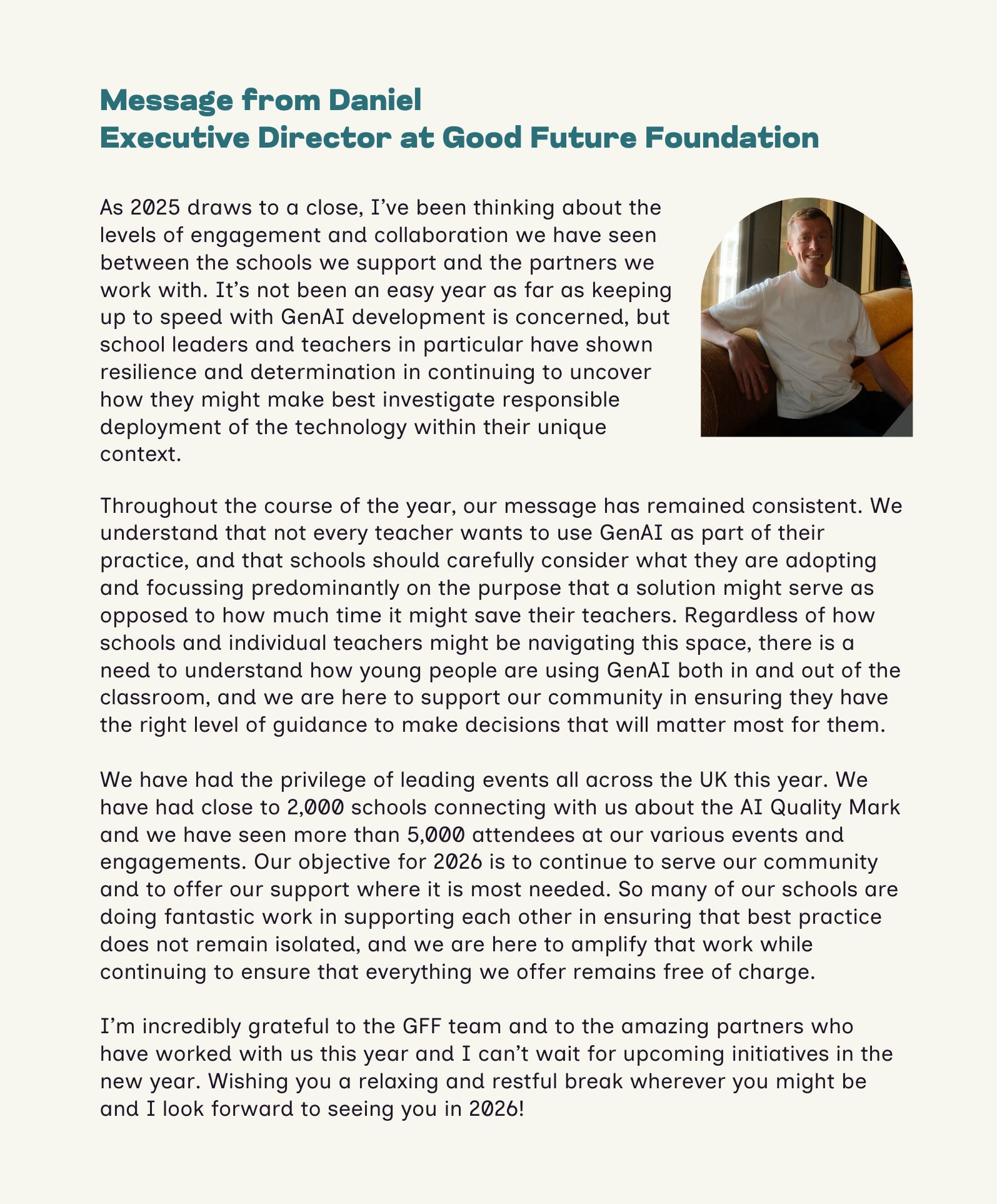 One of the themes at this conference is how AI should be addressed in the education sector to prepare and benefit future generations. The Big AI project, an initiative where Good Future Foundation serves as a key partner, will announce the national rollout of educator-developed resources designed to help school leaders and teachers nurture critical AI literacy skills in their students. More than 70 schools and trusts are currently piloting these materials, and an enhanced version will be launched at the conference in March.