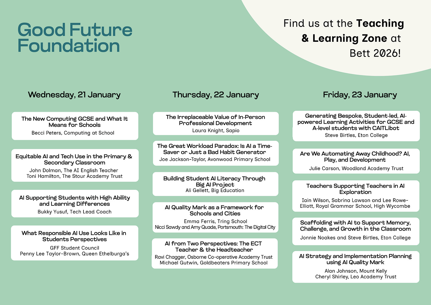 Throughout the three days at Bett, we have invited many of our partners and teachers who are passionate about getting AI right to enhance everyday teaching and learning to speak at our booth. Here’s a sneak peak of some of the sessions we have planned. We’ll share our full programme schedule on our website and LinkedIn in January.