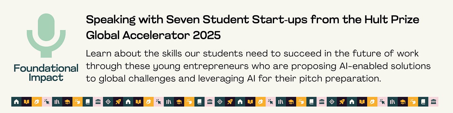 Following our conversation with the winning team of this year’s Hult Prize, this month’s episode features the other seven student start-ups as they competed for the $1 million prize to scale their ventures. These young entrepreneurs are either proposing AI-enabled solutions to global challenges, deploying AI to scale their impact, or leveraging AI for their pitch preparation.