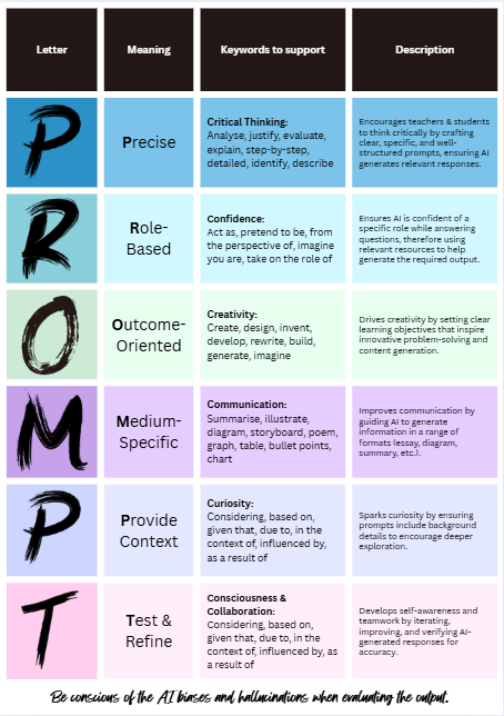 In our whole-school literacy programme, we emphasise the cycle of draft → refine → publish. Using prompts in the classroom mirrors that cycle: students draft, test, refine (feedback from AI or peers), and publish or evaluate. So prompt engineering becomes an extension of literacy, not a separate add-on.