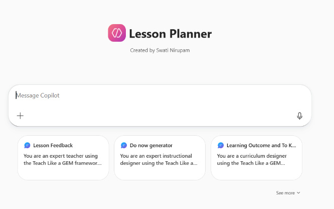 At Gems Winchester School, we are innovating how lesson planning looks in an AI age. Our teachers have been using a custom Copilot agent, a purpose-built tool that transforms how educators design instruction and embed the science of learning into daily practice. This AI agent is structured around Daniel Willingham’s cognitive principles and Doug Lemov’s proven classroom techniques, which our school has adapted into our planning and delivery model. With intelligent prompting, teachers turn every planning session into an opportunity to develop essential instructional skills: precision, consistency, differentiation, and reflection. The agent guides teachers through every stage of lesson design, helping them move from “filling in a template” to “thinking pedagogically through.” Teachers hence use AI to deepen instructional quality and practice deliberate planning.
