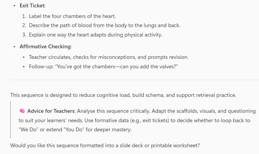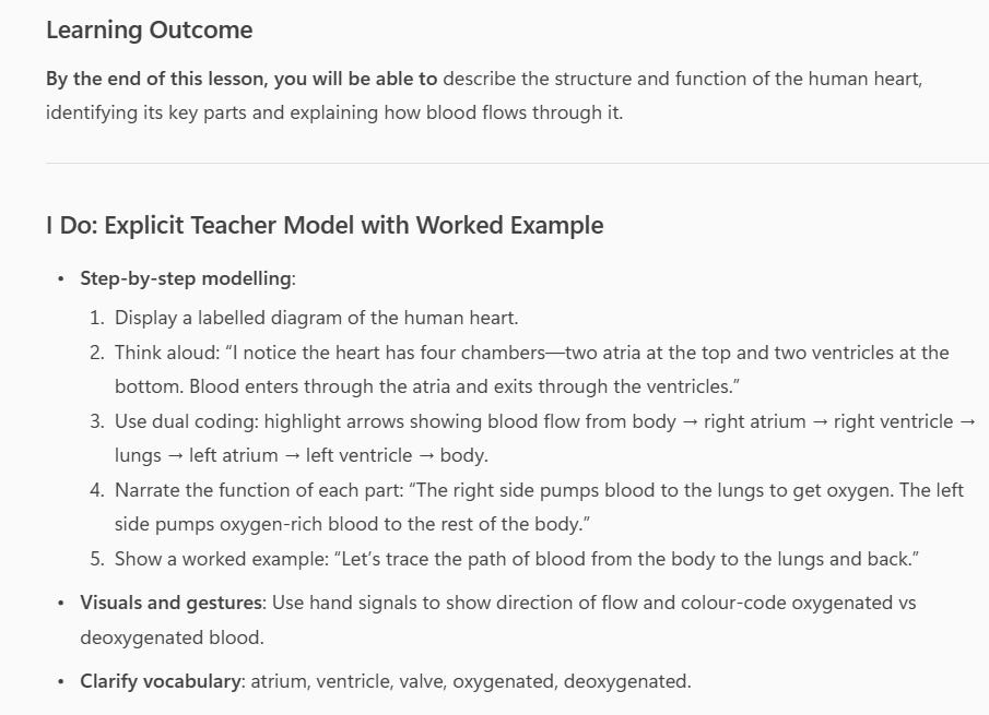 Curriculum-Aligned Outcomes: Inputting year group and topic (e.g., “Year 6 Circulatory system”) and receiving pre-generated learning outcomes focusing on procedural knowledge or skills to be gained and “To Know” essentials that are factual or conceptual knowledge components aligned with our curriculum standards.