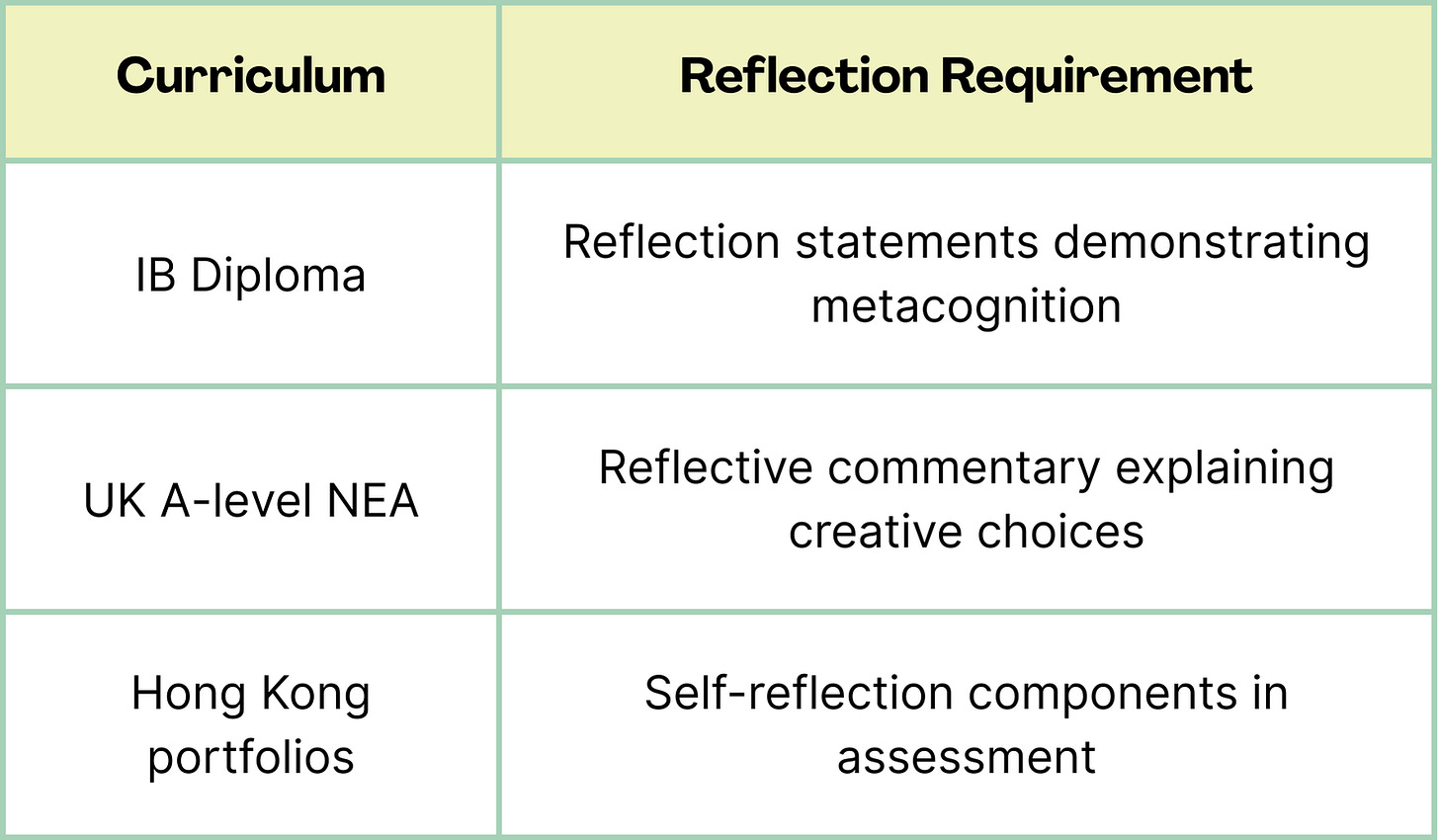 The building blocks exist: IB reflection statements, UK A-level NEA commentaries, and portfolio assessment in Hong Kong all point the way forward.